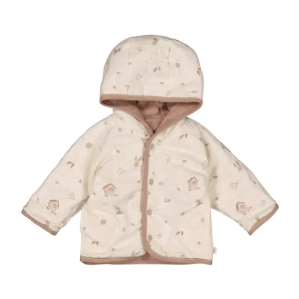 Aan de ene zijde vind je een warme hazelnootkleurige velours stof met een fijn herfstprintje, perfect voor koelere dagen. De andere zijde is gemaakt van een zachte jersey katoenmelange met dezelfde lieve print, waardoor je telkens kunt kiezen voor een andere look. Dankzij de handige drukknoopsluiting en de ruime pasvorm trek je het jasje eenvoudig aan en uit.