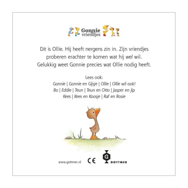 In het boekje ‘Wat wil Ollie?’ van Gottmer, een nieuw verhaaltje over een van Gonnies beste vriendjes, speelt het koppige, kleine gansje Ollie de hoofdrol. Ollie voelt zich niet blij en heeft nergens zin in, maar gelukkig weet Gonnie wel wat de kleine Ollie nodig heeft: een dikke, warme knuffel. Het kartonnen boekje is mooi verpakt in een cadeaudoos met een superzachte pluchen knuffel van Ollie. Zo kan er tijdens het voorlezen lekker gespeeld worden. Ook leuk om als kraamcadeau te geven!