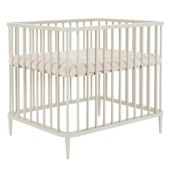 De box is voorzien van ronde spijlen en staat op vier luxe houten poten, wat zorgt voor een elegante uitstraling. De MDF-bodem is verstelbaar in vier standen, waardoor je de hoogte eenvoudig aanpast naarmate je kindje groeit. In de eerste maanden plaats je de bodem op de hoogste stand, zodat je gemakkelijk oogcontact hebt en je baby eenvoudig kunt oppakken. Zodra je kindje zichzelf kan optrekken, verlaag je de bodem om de veiligheid te waarborgen.