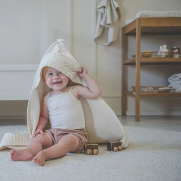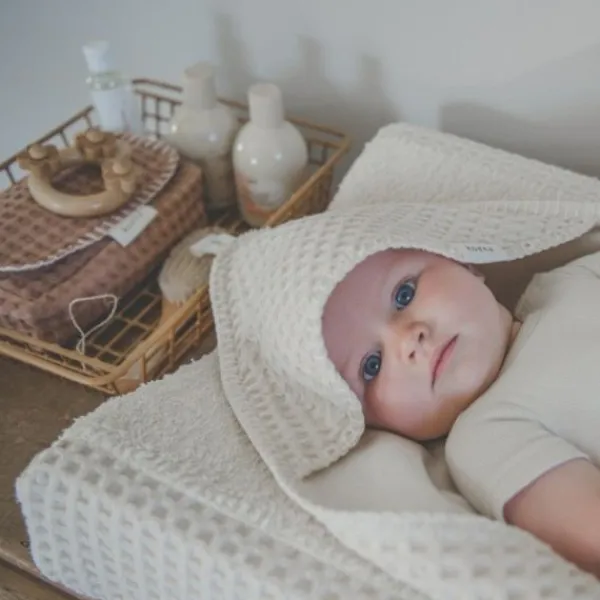 De Koeka omslagdoek met capuchon is met stretch badstof gevoerd en gebruik je om je baby in te wikkelen. Deze omslagdoek is voorzien van een opening zodat de doek ook met de gordels van de auto- of wipstoel gebruikt kan worden. Zo blijft je kleintje altijd comfortabel warm, zowel in huis als onderweg. De omslagdoek is ook fijn om te gebruiken tijdens het voeden. Met de ophanglus hangt de doek altijd binnen handbereik in de bad- of babykamer.