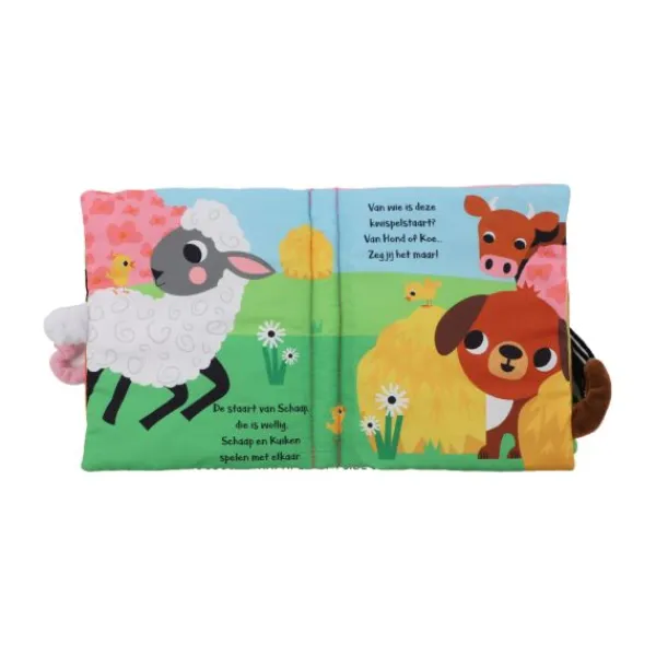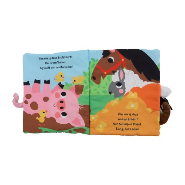 | In dit kleurrijke boxje zit een zacht knuffelboekje, speciaal voor kleine babyhandjes. Raad jij van wie de staartjes zijn? |