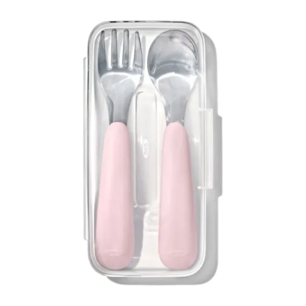 De OXO Tot Vork & Lepel Reisset maakt het simpel voor kleintjes om hun eten van het bord naar hun mond te krijgen. Dankzij het platte deel op de handgrepen blijven de vork en lepel op hun plek liggen en rollen ze niet van de tafel of kinderstoel. Bovendien zijn de zachte handgrepen ontworpen om niet in kommen of borden te glijden. Met deze set kunnen kinderen moeiteloos zelfstandig eten.