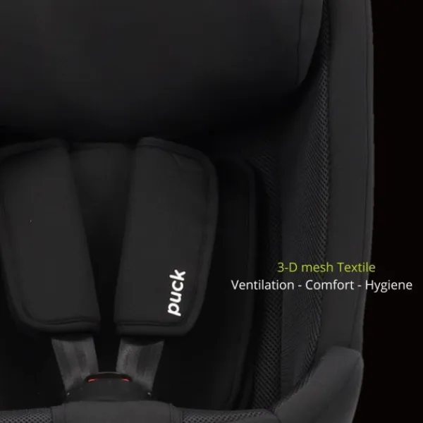 Voor het comfort van je kind is de Puck JUNE-black voorzien van een ventilerende 3D-mesh stof, wat vooral prettig is in de zomermaanden. Hierdoor blijft de huid droog en worden huidirritaties voorkomen. Vanaf de geboorte gebruik je de meegeleverde newborn inlay, zodat je ook voor de allerkleinsten tot 75 cm een perfecte pasvorm hebt. De zitting is gevuld met een comfortabele vulling, waardoor de stoel ook geschikt is voor langere autoritten. Daarnaast beschikt de stoel over 4 verschillende zit- en ligstanden, zowel voorwaarts als achterwaarts, en groeit de hoofdsteun met je kindje mee in 11 verschillende standen.