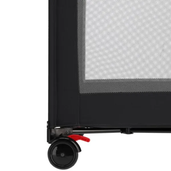 Verplaatsing gaat eenvoudig met twee soepel lopende achterwielen, terwijl vier brede poten garant staan voor uitstekende stabiliteit. De matrasbodem met schuim-toplaag is met klittenband op alle vier hoeken vast te maken, zodat er niets onder kan schuiven, en de gebruiksaanwijzing is slim op de bodem geprint – altijd bij de hand. Compleet geleverd met handige draagtas.