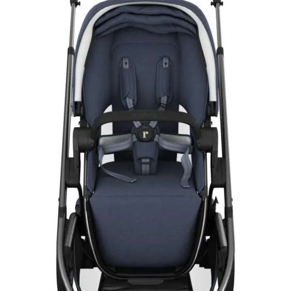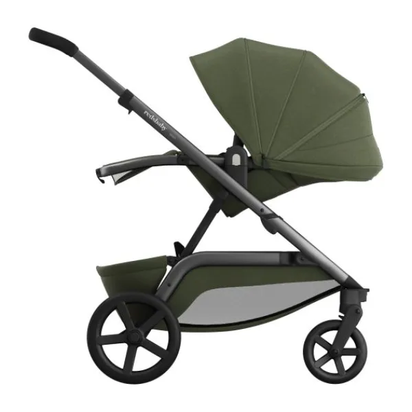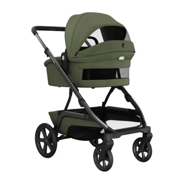 Gebruiksgemak staat centraal: de kinderwagen is opvouwbaar met zitjes bevestigd (in dubbele of enkele modus, zowel parent- als world-facing), het stuur is telescopisch (96–106 cm), en beide zitjes en reiswiegen zijn met één hand te verwijderen. De extra grote mand (12 kg draaggewicht) is vanaf beide kanten toegankelijk. Vergrendelbare zwenkwielen vooraan en visuele indicators tonen wanneer alles veilig vastzit.
