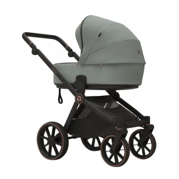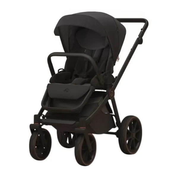 De ruime reiswieg is voorzien van een ademende kokosmatras en zachte, gewatteerde katoenen voering voor maximaal comfort. Dankzij drie ventilatiepunten, waaronder in de bodem, is er altijd een aangenaam binnenklimaat. Het zitgedeelte is volledig verstelbaar voor zit- en slaaphoudingen en is bekleed met luxe eco-leer op de duwstang en bumperbar voor extra comfort voor ouder en kind.