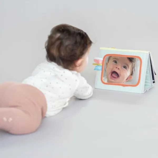 Dit dubbelzijdig, zachte en knisperende babyboekje van Taf Toys is geschikt voor twee ontwikkelingsstadia. Het boekje heeft mooie illustraties, verschillende texturen en leuke activiteiten. Het boekje maakt gebruik van het flip-and-play concept en staat rechtop om je baby te stimuleren om de buik spelen. Ontwikkelingsfase 1 (0m+): contrasterende illustraties, steeds 1 tekening om overprikkeling te vermijden en een babyveilige spiegel. Ontwikkelingsfase 2 (3m+): een 3D leeuwtje met bijtring, kiekeboe flapjes in de vorm van een boom en een zilverkleurig wolkje, kleurrijke illustraties en fluffy gestructureerde stoffen.