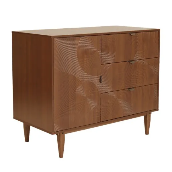 De bijbehorende commode heeft drie ruime lades en één deur met daarachter een legplank. Dankzij het soft-close systeem sluit alles geruisloos en veilig. De bovenkant van de commode biedt voldoende ruimte voor een aankleedkussen, zodat je jouw baby gemakkelijk kunt verzorgen. Het 3D-patroon loopt mooi door over de lades en deuren, wat de commode een luxe en samenhangende uitstraling geeft.