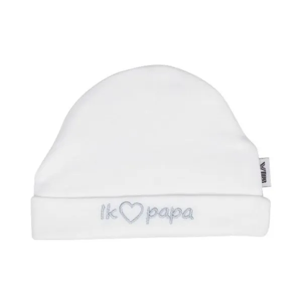 Deze muts is geheel wit met op de voorkant ‘ik “hartje” papa’ in het zilver.