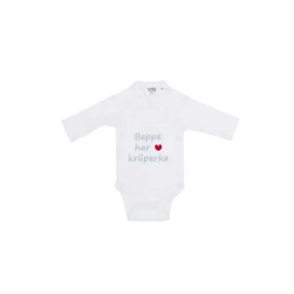 Dit super schattige rompertje is van het merk VIB® (Verry Important Baby). Deze romper is geheel wit van kleur met de lieve tekst ”Beppe har Krûperke” met een hartje erbij.