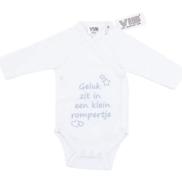 Dit super schattige rompertje is van het merk VIB®. Deze romper is geheel wit van kleur met de lieve tekst ”Geluk zit in een klein rompertje”.