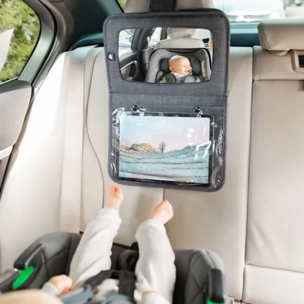 De autospiegel is eenvoudig te bevestigen aan de hoofdsteun van je auto en verstelbaar voor de beste kijkhoek. De geïntegreerde tablethouder heeft een doorzichtig scherm waardoor je kindje gemakkelijk films of spelletjes kan kijken, zonder de tablet zelf te hoeven vasthouden.