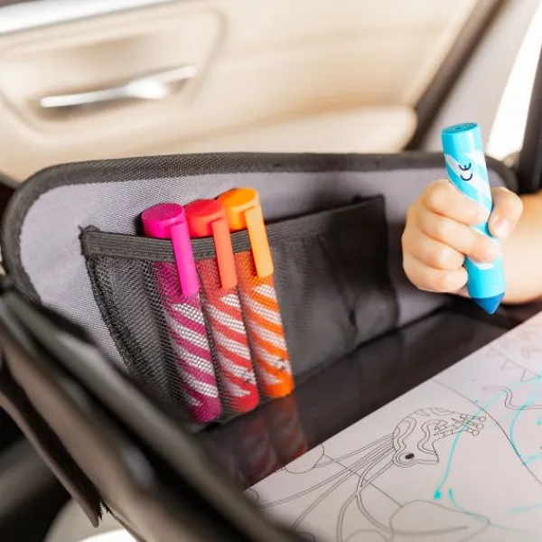 Deze reistafel beschikt over handige opbergvakken voor drinkbekers, stiften, boekjes en zelfs een transparante tablethouder om films te kijken zonder de tablet vast te houden. De tafel kan eenvoudig bevestigd worden aan elk autostoeltje, en dankzij het opvouwbare design neem je hem overal gemakkelijk mee naartoe.